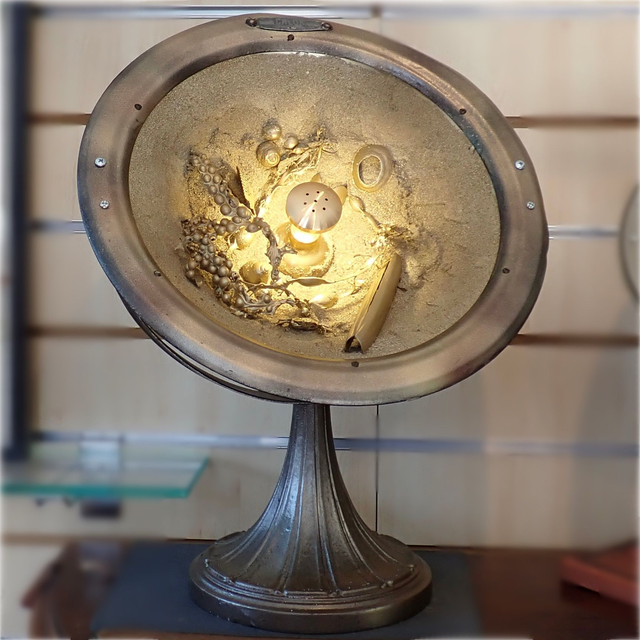 Un univers créé à partir d'un radiateur ancien : un monde doré entre le réel et le fantastique.